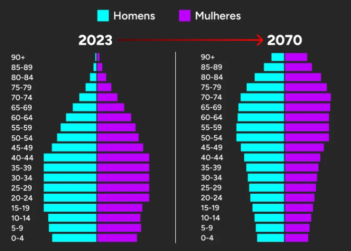É impossível brigar com a matemática. Veja no gráfico a quantidade de pessoas com idade ativa e trabalhando em 2023 e em 2070. Serão mais dependentes do que contribuintes para o sistema.